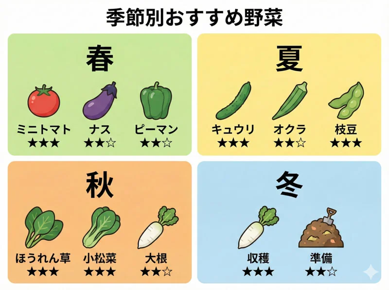この記事では、「いつ何を植えればいいか」がひと目でわかる年間カレンダーと、季節ごとの初心者向けおすすめ野菜をご紹介します。「今から始めるなら何がいい?」という疑問にも、季節別にお答えします。完全初心者向けの準備ガイドと合わせてご覧ください。