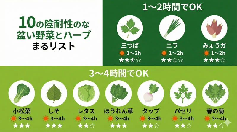 | 陰性植物 | 1〜2時間 | 日陰を好む | ミツバ、ミョウガ、ニラ |