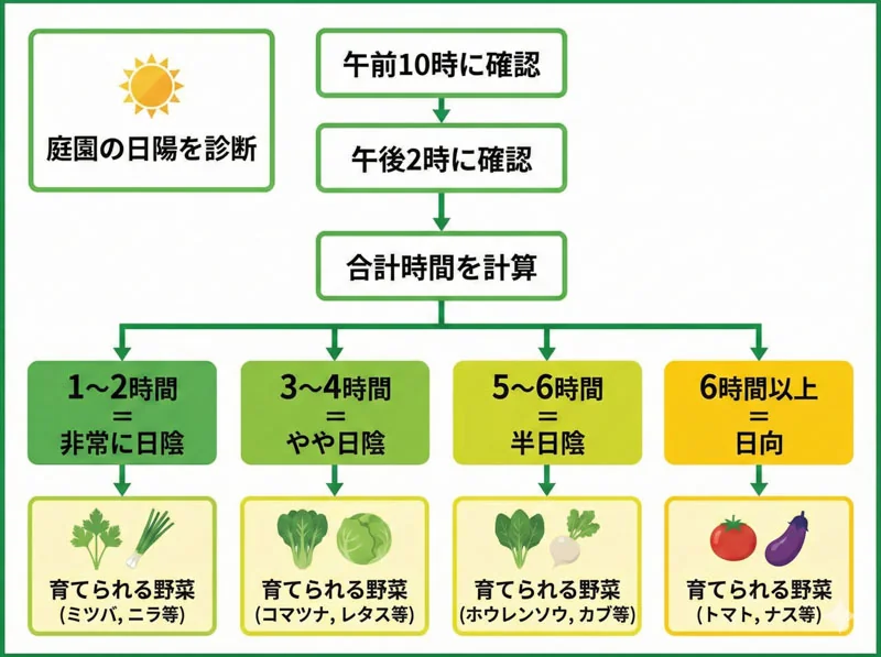 - 自分の庭の日照時間を診断 — 1〜2時間、3〜4時間、半日の3段階