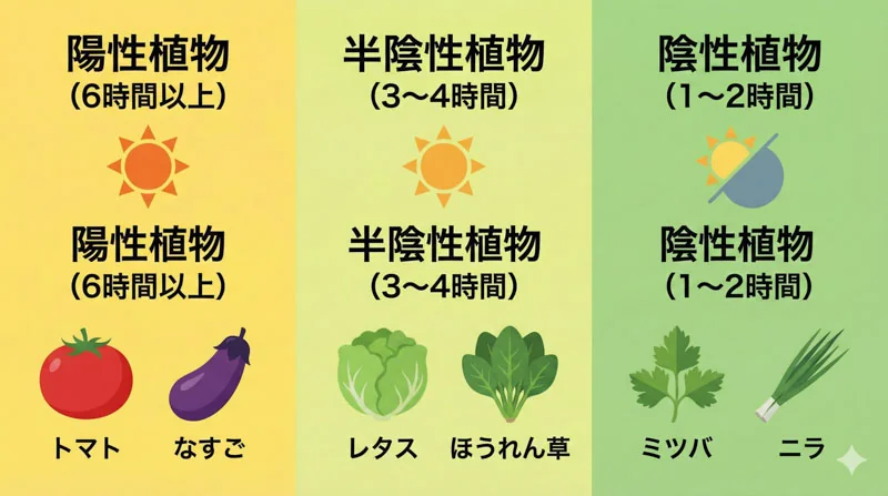 | 半陰性植物 | 3〜4時間 | 半日陰でOK | 小松菜、ほうれん草、レタス、シソ |
